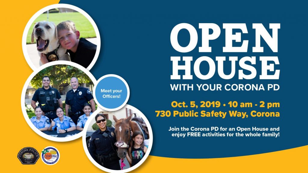 The Corona Police Department invites the community to an Open House on Saturday, Oct. 5, 2019, from 10 a.m. to 2 p.m. Stop by the Corona Police Department, located at 730 Public Safety Way, and enjoy FREE activities for the whole family!