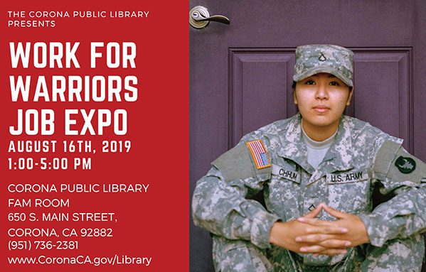 The Corona Public Library, in collaboration with Work for Warriors, will be hosting a job expo on Friday, August 16, beginning at 1 p.m. The Job Expo will feature job opportunities for veterans in the fields of manufacturing, security, clerical work, and more!